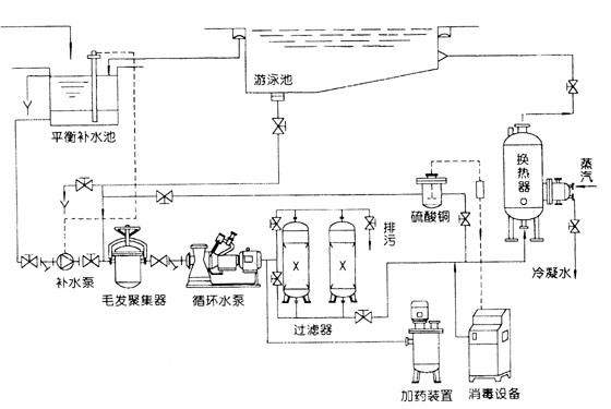 (1)把重點放在水處理除污能力和確保高質(zhì)量出水上。從中外游泳池,凡開群眾場時,到了夏季人流高峰期,水質(zhì)變壞的事實看,無論多短的循環(huán)周期,無論多大的循環(huán)流量都無濟于事,那么,還要再縮短周期多少?再加大循環(huán)流量多少?還要用多大的代價才能使水質(zhì)改善?誠然不是辦法。為何單純砂濾顯得無能為力呢?因為縮短循環(huán)周期,加大循環(huán)流量的結(jié)果是,一次次的在密閉容器里穿透,形成無效空轉(zhuǎn)。有人要問,為何不加藥絮凝?眾所周知,這種池水的絮凝效果很難令人滿意。能不能把主攻方向改變一下呢?試想,我們把主攻方向改變?yōu)樵黾映勰芰,確保出水質(zhì)量和水的氧化與活化上,情形就會完全不一樣了。大家都有這樣的經(jīng)驗,在沒有水處理的換水泳池。第一天注入的新鮮水,在人流高峰期的夏季也是不會壞的,第二天也沒有壞,第三天開始才明顯變壞。有水處理設(shè)備的水質(zhì)變壞也不是1~2天的事情,而是多日水處理不達標累積造成的。假如我們天天真正做到都能處理一遍,使這有限的一池水,成為高質(zhì)量的新鮮水,應(yīng)該是沒有問題的。我們試著這樣做了,在上百個館池和水上樂園取得了巨大成功。