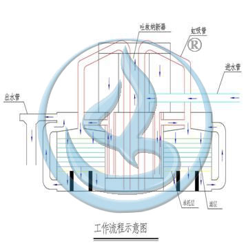 自來水由進(jìn)水管送入設(shè)備,經(jīng)過濾層清水從連通管進(jìn)入清(沖洗)水箱內(nèi)貯存。水箱充涌后,進(jìn)入出水槽,通過出水槽螺旋曝氣充氧裝置再次曝氣充氧出水。