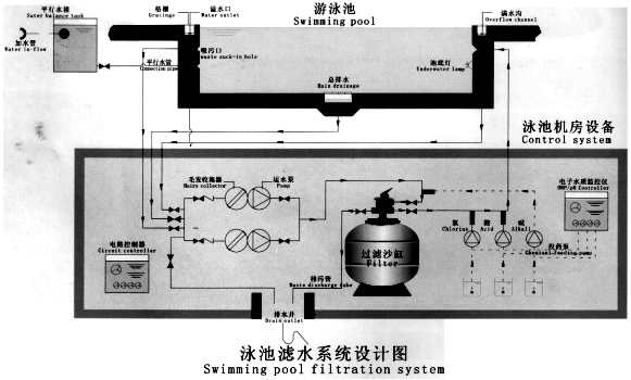 三、循環(huán)過濾給水系統(tǒng):將游泳池污水,經(jīng)凈化、消毒符合水質(zhì)要求后,再送入游泳池的過濾設(shè)備,經(jīng)過濾設(shè)備處理后循環(huán)使用,是目前普遍采用的給水系統(tǒng)。對于水源貧乏地區(qū)、室內(nèi)游泳池和正式比賽用的游泳池,具有節(jié)約水資源和能源的重要意義。