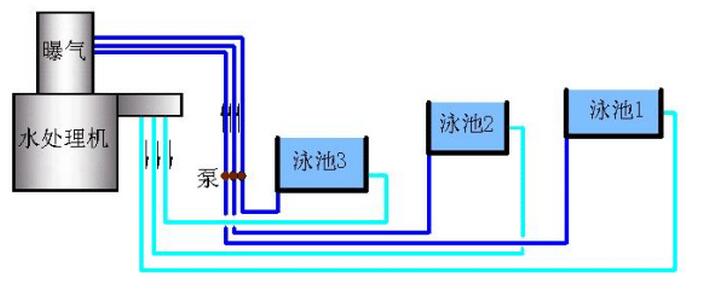 我們作過7個(gè)泳池使用1套水處理設(shè)備的工程,已經(jīng)過多年運(yùn)營,實(shí)踐證明效果極佳。