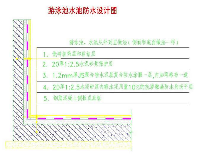 以上就是一個(gè)完整的標(biāo)準(zhǔn)的游泳池防水做好了。由于我們國(guó)家無(wú)建筑防水專(zhuān)業(yè),所以面對(duì)游泳池防水設(shè)計(jì)似乎沒(méi)標(biāo)準(zhǔn)可言,很多人設(shè)計(jì)人員也不知道游泳池里面需要做一道剛性微晶防水層的,只知道做防水涂料,此防水方案是我公司用10多年的建筑結(jié)構(gòu)設(shè)計(jì)經(jīng)驗(yàn)結(jié)合對(duì)多個(gè)游泳池防水設(shè)計(jì)的跟蹤得出的結(jié)果。游泳池防水必須做剛?cè)峤Y(jié)合兩道設(shè)防,那樣才是保險(xiǎn)的,其實(shí)真正起到防水作用的是游泳池的鋼筋混凝土底板和側(cè)板,微晶防水剛性層,防水涂料其實(shí)是起到輔助防水,但很多設(shè)計(jì)師也不是很清楚。