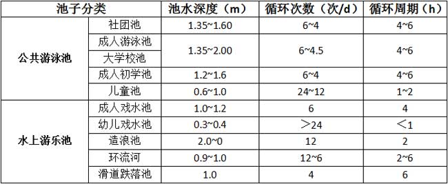 游泳池由于用途不同而循環(huán)周期也會(huì)不相同;水上游樂池也是因?yàn)槠溆猛镜牟煌h(huán)周期也不同。除了用途,也包括泳池的水深、泳池負(fù)荷等因素確定循環(huán)周期;蛉缦卤恚