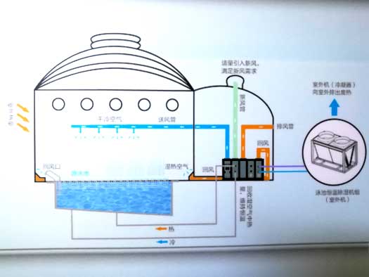 在夏季,需要進行空氣冷卻時,制冷劑就繞過再加熱盤管和池水冷凝器流向外機冷凝器,讓來自蒸發(fā)器的冷空氣給室內(nèi)游泳館提供干燥涼爽的空氣環(huán)境。