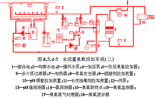 (2)人數(shù)負(fù)荷較高,池水衛(wèi)生要求較高的游泳池和水上游樂(lè)池,宜采用循環(huán)水過(guò)濾與殘余臭氧吸附過(guò)濾合并的循環(huán)水全部進(jìn)行消毒的全流量臭氧消毒系統(tǒng)。