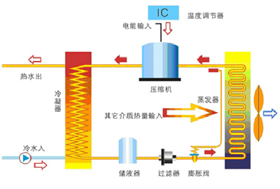 泳池?zé)岜脵C(jī)組系統(tǒng)工作過程:處于低壓液態(tài)循環(huán)工質(zhì)(如氟利昂R22、404a)流經(jīng)泳池?zé)岜脵C(jī)組的蒸發(fā)器時(shí)蒸發(fā),此時(shí)從低溫?zé)嵩刺幬諢崃,變成蒸氣后,流進(jìn)壓縮機(jī),經(jīng)過壓縮機(jī)壓縮后升溫升壓,變成高溫、高壓蒸氣,排出壓縮機(jī),蒸汽流經(jīng)泳池?zé)岜脵C(jī)組冷凝器,在冷凝器中,將從蒸發(fā)器中吸取的熱量和壓縮機(jī)耗功所相當(dāng)?shù)哪遣糠譄崃颗懦觯瑐鬟f給流經(jīng)泳池?zé)岜脵C(jī)組的鈦管中的冷水,使其溫度提高。循環(huán)工質(zhì)蒸汽冷凝降溫后變成液相,高壓液體流經(jīng)膨脹閥后,壓力下降,變成低壓液體,低壓液相工質(zhì)流入蒸發(fā)器,由于沸點(diǎn)低,因而很容易從周圍環(huán)境吸收熱量而再蒸發(fā),又形成低溫低壓蒸汽,依此不斷地進(jìn)行重復(fù)循環(huán)。就能使低溫?zé)崃窟B續(xù)不斷地傳遞到高溫?zé)嵩矗ㄋ┨帲詽M足泳池水加熱恒溫需求。