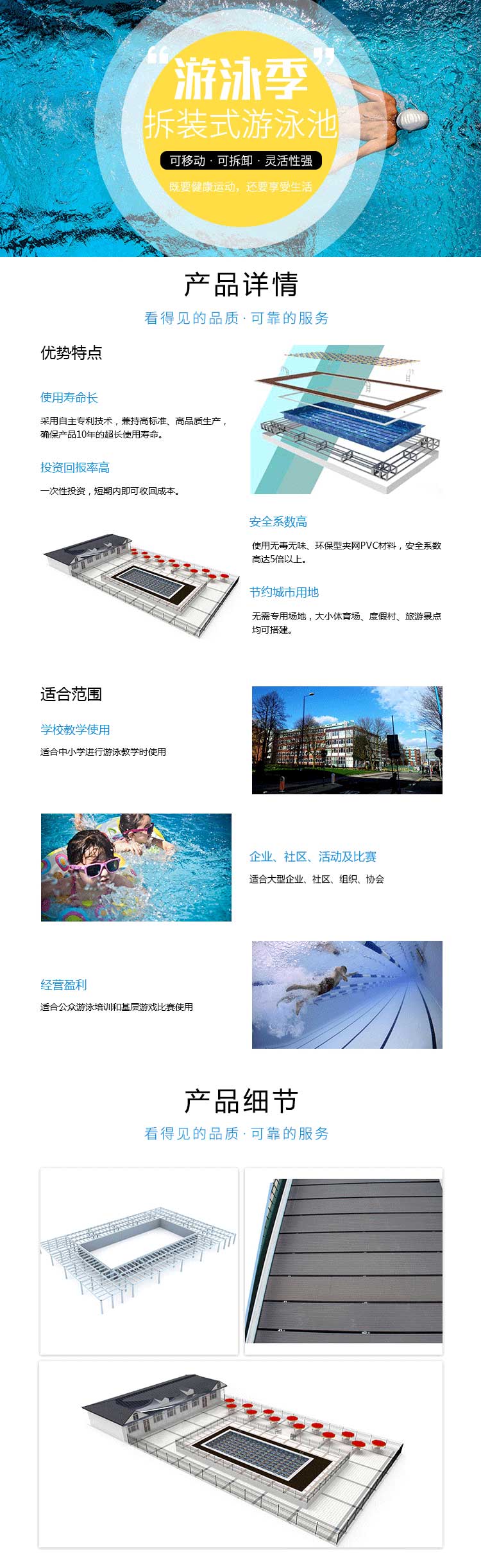 本公司對拆裝式泳池進行研發(fā)制造,至今已積累豐富經(jīng)驗,掌握和攻克了大量的技術(shù)難關(guān),現(xiàn)在公司產(chǎn)品的構(gòu)造、工藝已達(dá)到了國內(nèi)外先進水平。并以產(chǎn)品安全可靠的品質(zhì)、溫馨優(yōu)質(zhì)的售后、全面貼心的配套服務(wù)獲得客戶的一致好評。